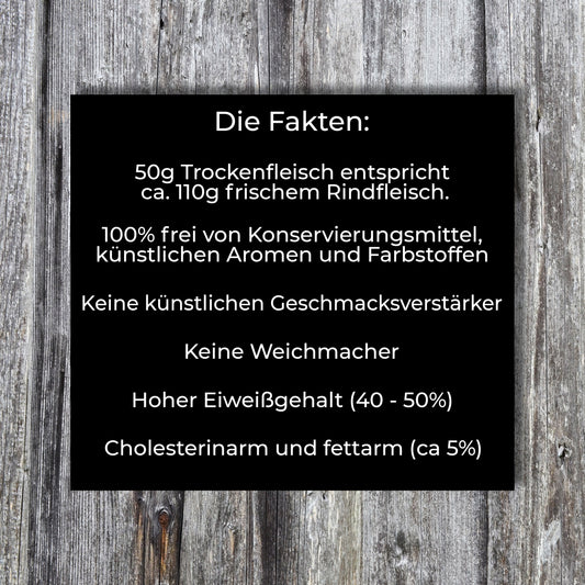 Plain or with a sophisticated marinade: We have the ideal snack pack for every taste . Do you appreciate the pure taste of the finest jerked meat? The Light Mild Box, with its Salt & Pepper, Smoky Original, and Austrian Style varieties, perfectly showcases the authentic flavors of beef! Prefer something really spicy? Then our Big Spicy Box is just what you need. With Mexican Style Beef Jerky and Hawaiian Teriyaki in your snack pack, you can enjoy the tangy heat of Mexican cuisine and the fruity, tropical flavors of the legendary Aloha State.