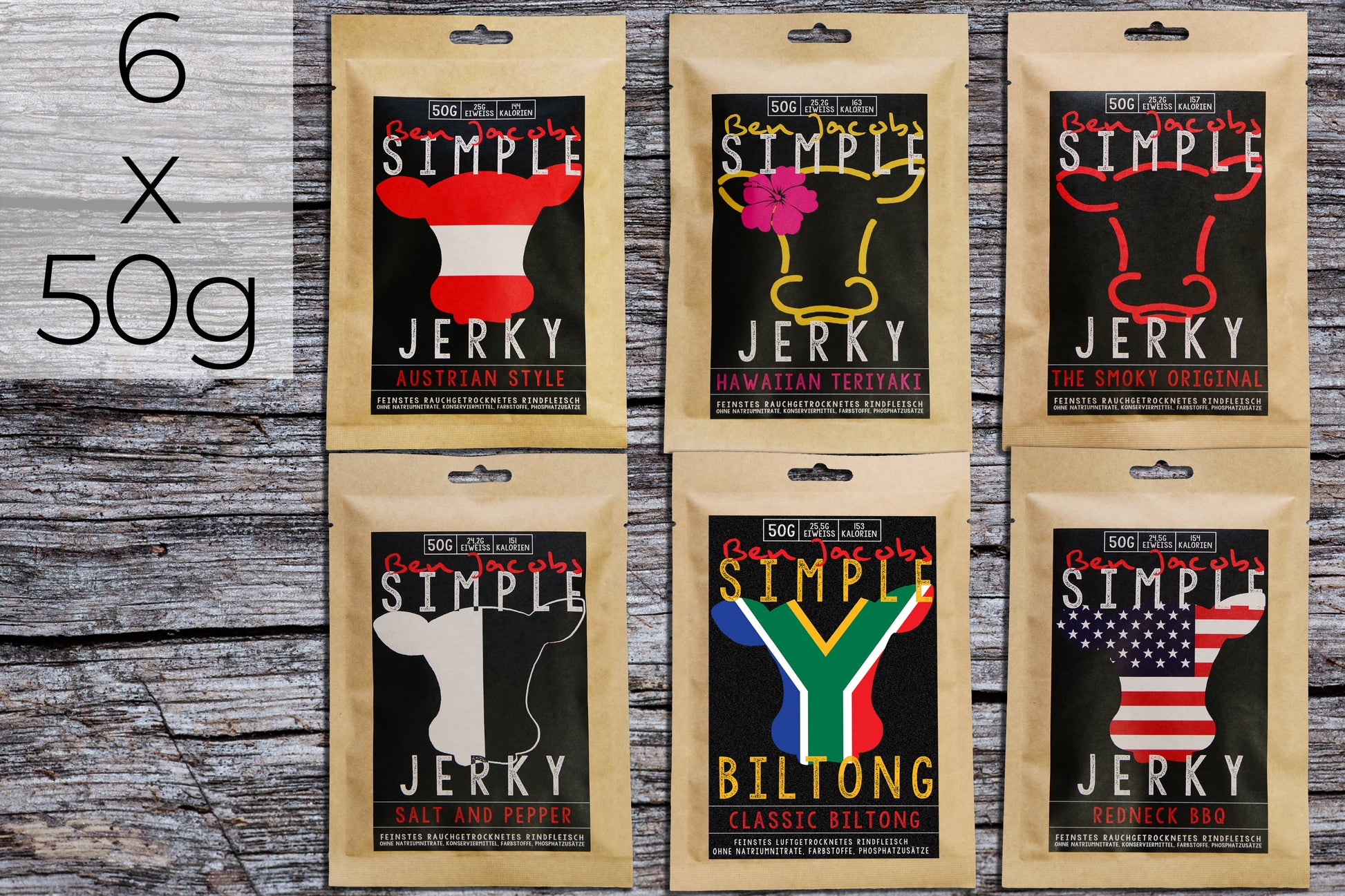 Unsere Sample Box enthält alle köstlichen Beef Jerky Zubereitungen sowie unser klassisches Biltong in einer Bestellung! Die Sample Box ist nicht nur perfekt zum Durchprobieren, sondern auch das ideale Geschenk für jeden Beef Jerky-Liebhaber - mehr Jerky-Genuss geht nicht!